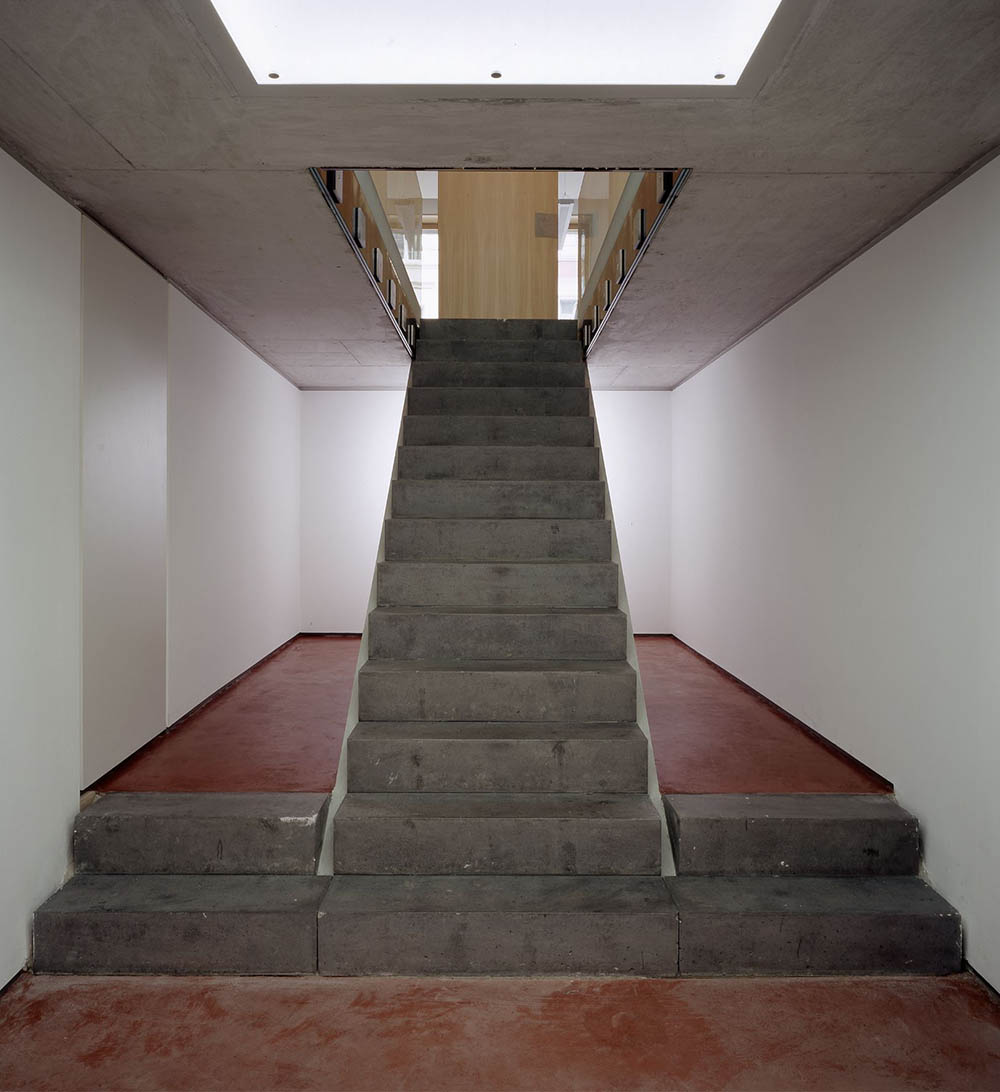 Der Charakter der vorgefundenen Räume wurde teils erhalten, teils neu übersetzt. Die Betondecke von 1908 verblieb. Die Hoffenster wurden als thermisch getrennte Stahlfenster ausgeführt, während die straßenseitigen Fenster gemeinsam mit einem führenden Hersteller neu entwickelt wurden. Im Untergeschoss, das vorwiegend Konferenzzwecken dient, wurden Akustikdecken integriert und eine hinterleuchtete Glaswand zur Präsentation installiert. Der im Erdgeschoss schwarz durchgefärbte, magnesiumgebundene Industrieestrich wurde hier in roter Farbe ausgeführt.